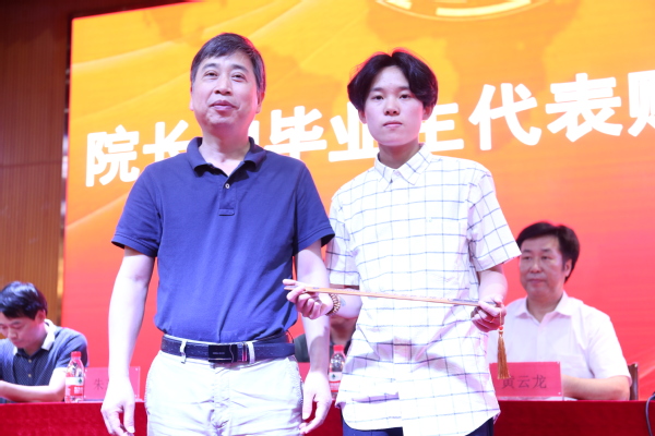 为提醒同学们在步入社会后不忘初心,牢记“干净办事、公道做人”是立身之本、事业之基、幸福之源,凡事做到“心中有信仰、举手有分寸、举足有尺度”,经济管理学院向每位毕业生赠送戒尺。院长朱芝洲为毕业生代表赠礼。
