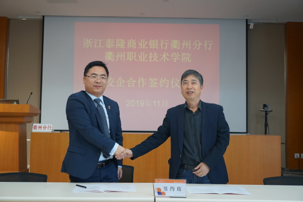 11月6日下午,我校与浙江泰隆银行衢州分行就第三期泰隆班的开设签订校企合作协议,校党委委员、副校长傅元勋和浙江泰隆银行衢州分行副行长黄小佳为签约仪式致辞。