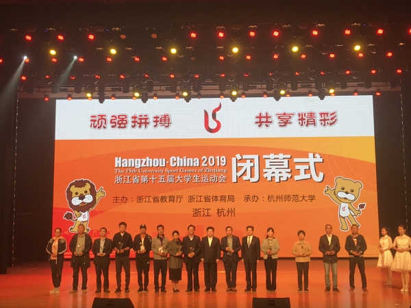 11月10日,浙江省第十五届大学生运动会在杭州师范大学圆满收官,本次大运会我校共参加了排球、羽毛球、健美操、武术、游泳、田径六个竞赛项目和一个阳光项目,共获得奖牌20枚,其中金牌14枚,银牌5枚,铜牌 3枚。同时,以团体总分第三名的优异成绩评为“校长杯”获奖单位。校党委副书记、校长江爱民出席闭幕式,并上台领奖。