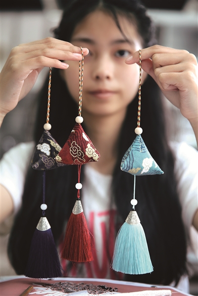 两校师生们制作的古风香包的款式有三种,其中最为复杂的是刺绣款的艾草香包。市特殊教育学校的老师告诉记者,这款香包最难的部分是绣花。制作一只刺绣款的香包一般需要半天时间,所以这款香包的价格也是最贵的,定价是36元/只。其他的两款,带流苏的香包定价是18元/只,普通款古风香包8元/只。