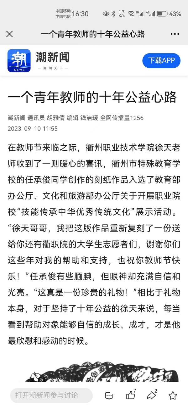 在教师节来临之际,日韩欧美福利视频_黑人巨大人精品欧美三区_欧美成人另类人妖_欧美在线精品一区二区三区_欧美一区二区三区性视频_日韩精品欧美视频_性欧美极品xxxx欧美一区二区徐天老师收到了一则暖心的喜讯,衢州市特殊教育学校的任承俊同学创作的刻纸作品入选了教育部办公厅、文化和旅游部办公厅关于开展职业院校“技能传承中华优秀传统文化”展示活动。“徐天哥哥,我把这版作品重新复刻了一份送给你还有衢职院的大学生志愿者们,谢谢你们这些年对我的帮助和支持,也祝你教师节快乐!”任承俊有些腼腆,但眼神却充满自信和光亮。“这真是一份珍贵的礼物!”相比于礼物本身,对于坚持了十年公益的徐天来说,每当看到帮助对象能够自信的成长、成才,才是他最欣慰和感动的时候。