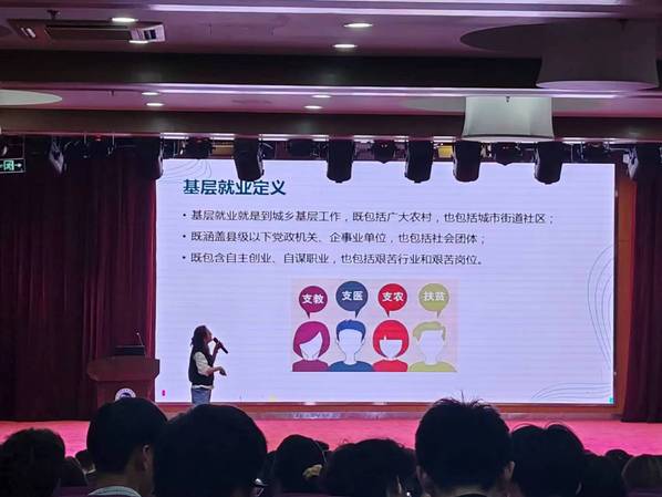 宋莉莉回顾了在衢职的大学时光,讲述了母校老师们给自己人生观、价值观带来的积极影响,细数了就业过程中的困难和成长,介绍了残疾人之家可爱的“家人”发生的故事,情至深处,宋莉莉潸然泪下。宋莉莉鼓励全体同学们珍惜在校时光,树立正向价值观,承担社会责任,鼓励同学们去国家最需要的地方就业,关注基层就业岗位。随后,校学工部就业指导中心给大家普及了基层就业相关要求及政策,列举当下基层岗位,鼓励同学们广开就业思路,如有机会,义无反顾投身基层就业,为国家贡献青春力量。