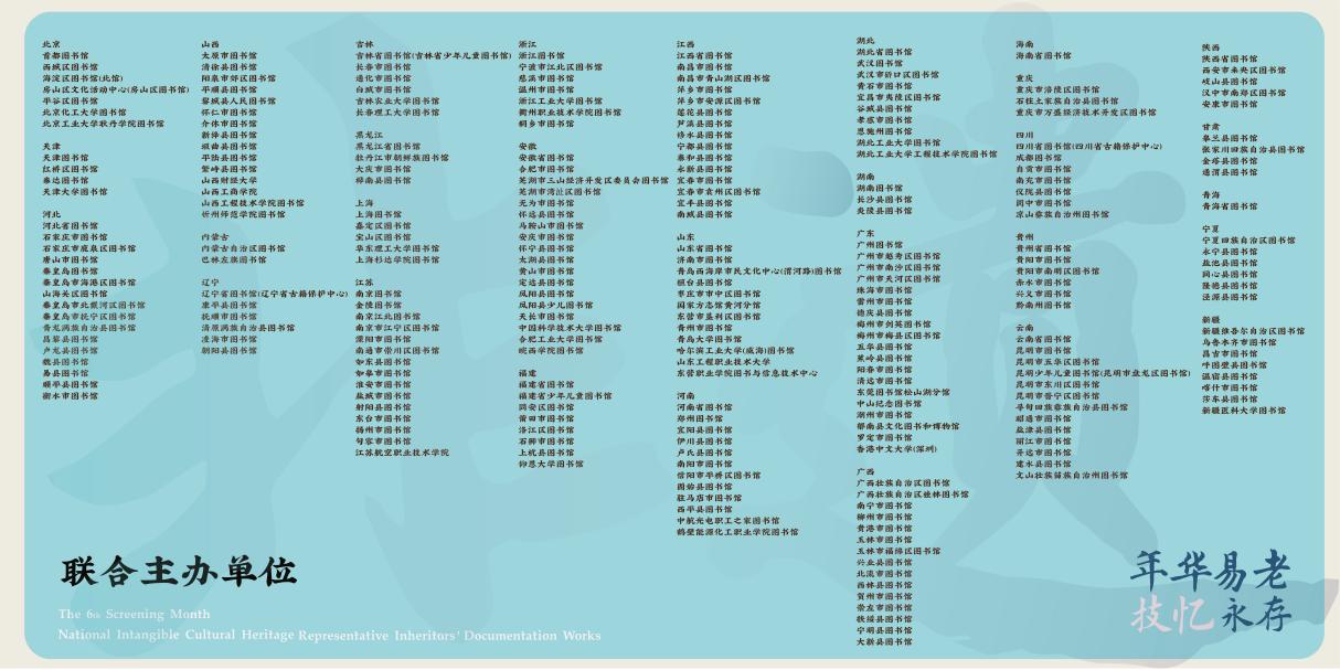 本次展映月活动属于2024年“文化和自然遗产日”非遗宣传展示活动,由国家图书馆联合全国两百余家各级各类图书馆共同主办。国家级非物质文化遗产代表性传承人记录工作(以下简称“记录工作”)自2015年启动以来,已对两千余名国家级代表性传承人进行了全面的影像记录和文献采集,目前已有一千余个记录项目通过验收。这些成果全面、真实、系统地记录了传承人掌握的精湛技艺,也为非遗的传承、研究留下了珍贵的“种子”,具有重要的史料价值和传播价值。本次活动主要是对记录工作的优秀成果进行展示和展映。
