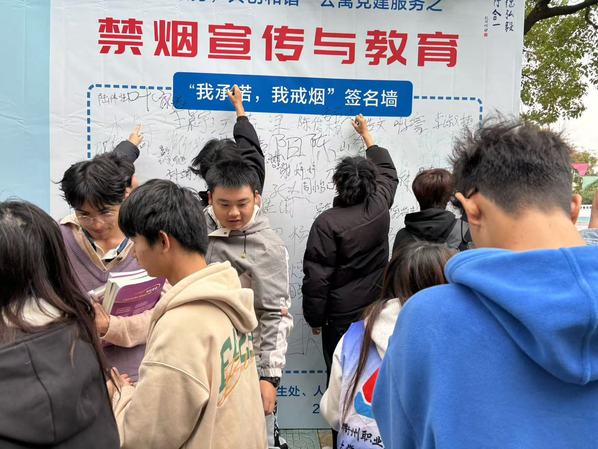 活动中,特别设置了“我承诺,我戒烟”签名墙。同学们纷纷在墙上签名,承诺戒烟或支持禁烟。签名墙上密密麻麻的名字,不仅见证了同学们的决心和勇气,更体现了大家对无烟校园建设的共同期待和承诺。为了鼓励更多同学参与禁烟宣传,活动还特别设置了答题活动。凡是在签名墙上签名的同学,都有机会参与答题赢取精美的礼品。